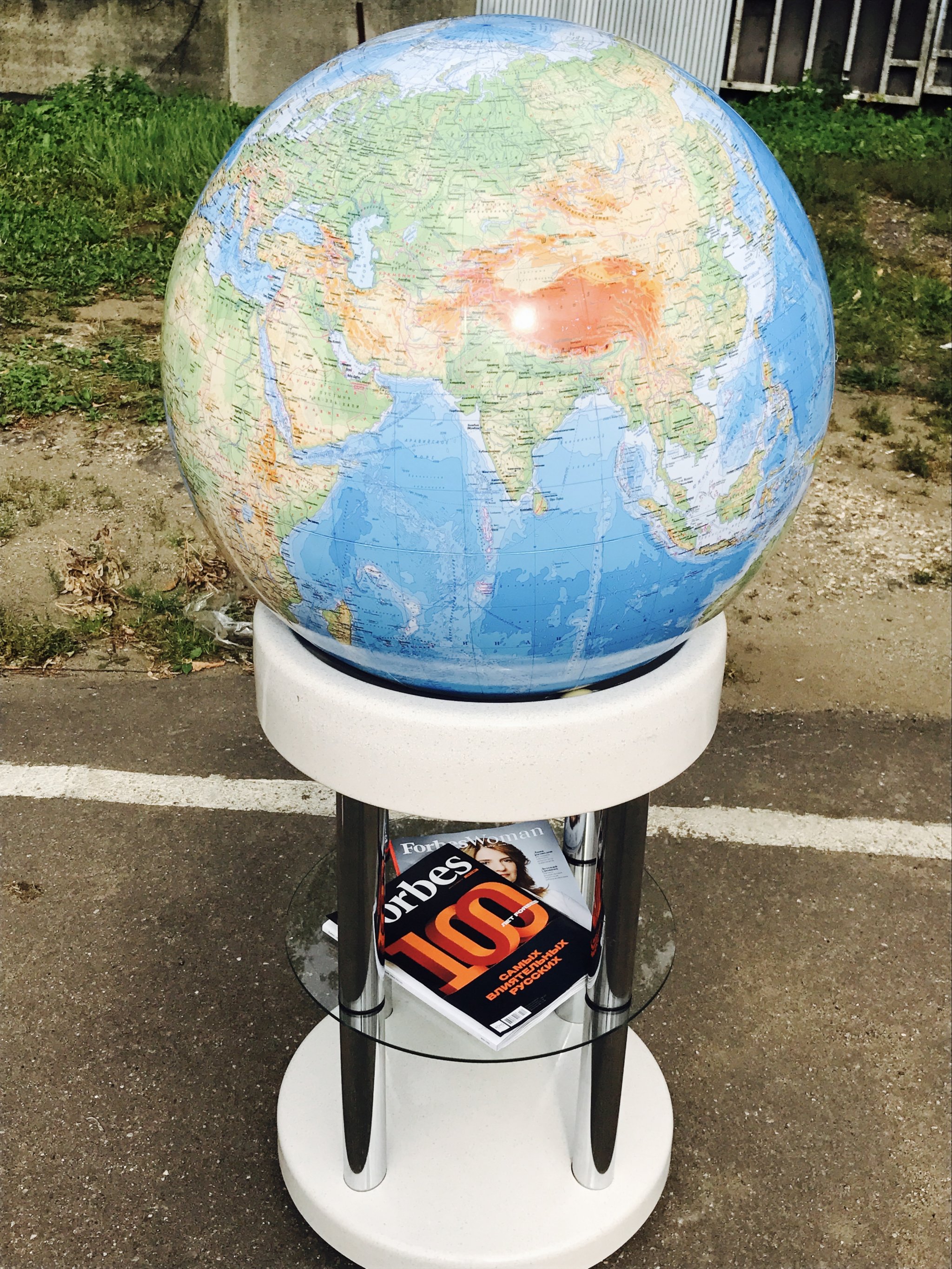 Сфера диаметром 64 см оклеена вручную специальной пленкой для рекламных работ, на которую нанесена карта. Поверхность карты дополнительно ламинируется для защиты от повреждений.