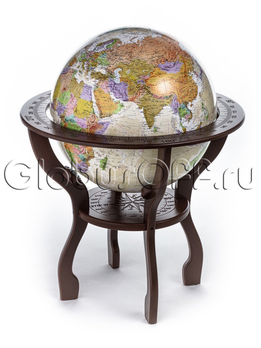 Подставка глобуса устойчива, высота варьируется от 70 до 90 см в зависимости от ее вида. Может быть изготовлена из стеклопластика, литьевого мрамора, металла, натурального дерева.
